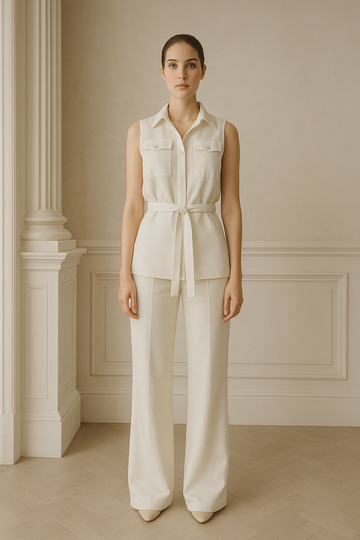 Conjunto sastre blanco de corte estructurado, compuesto por blazer y pantalón recto. La chaqueta presenta...