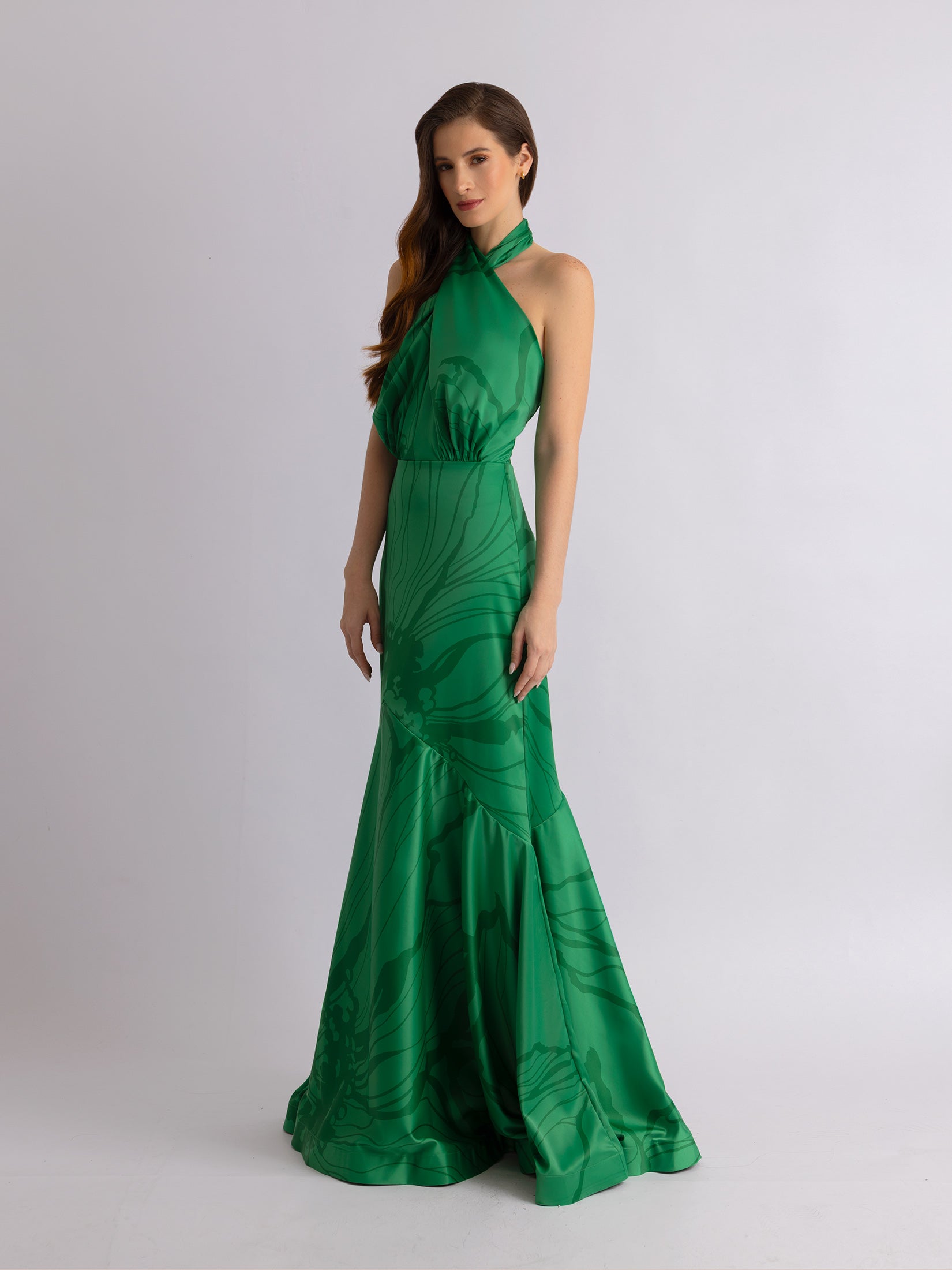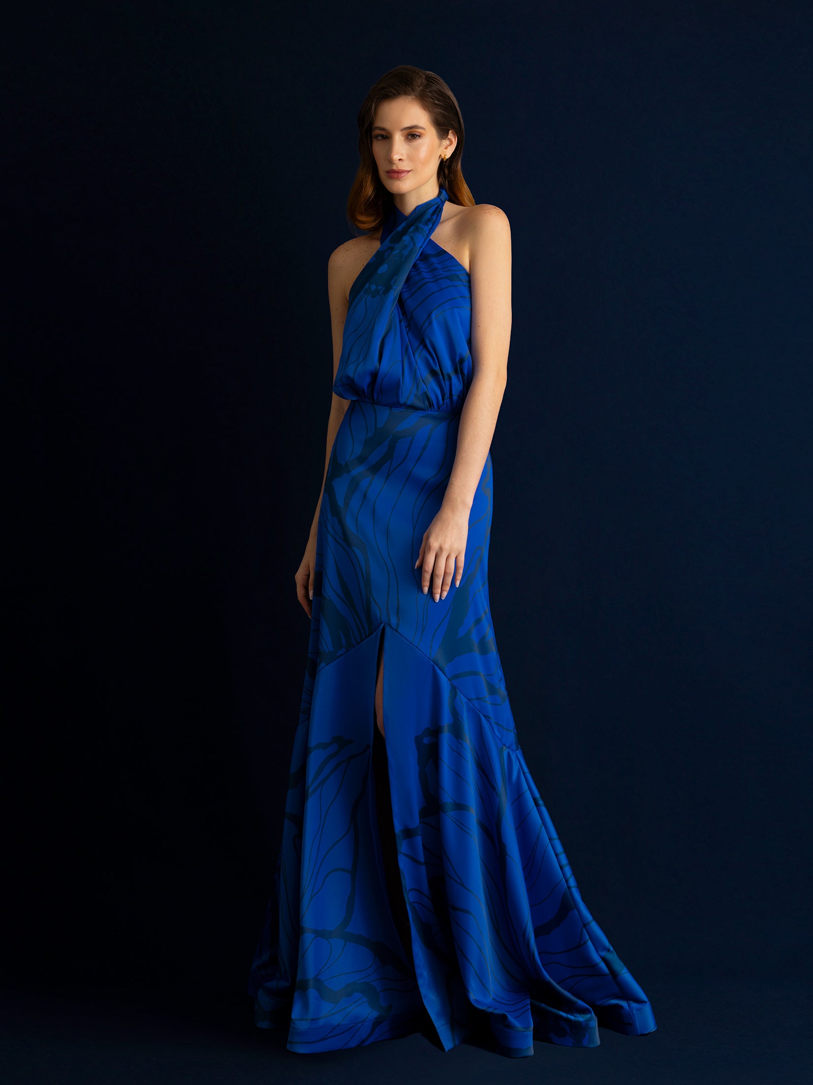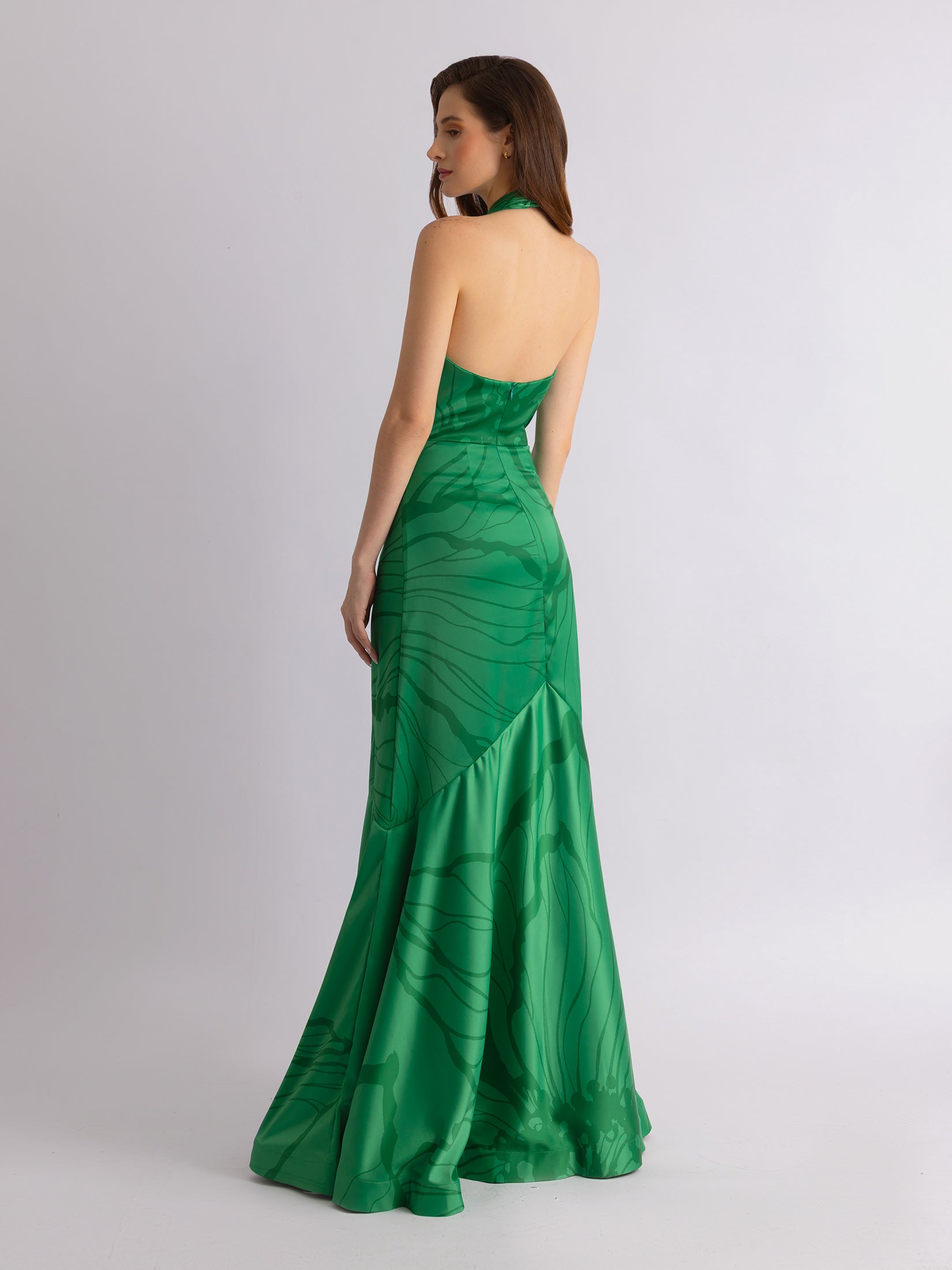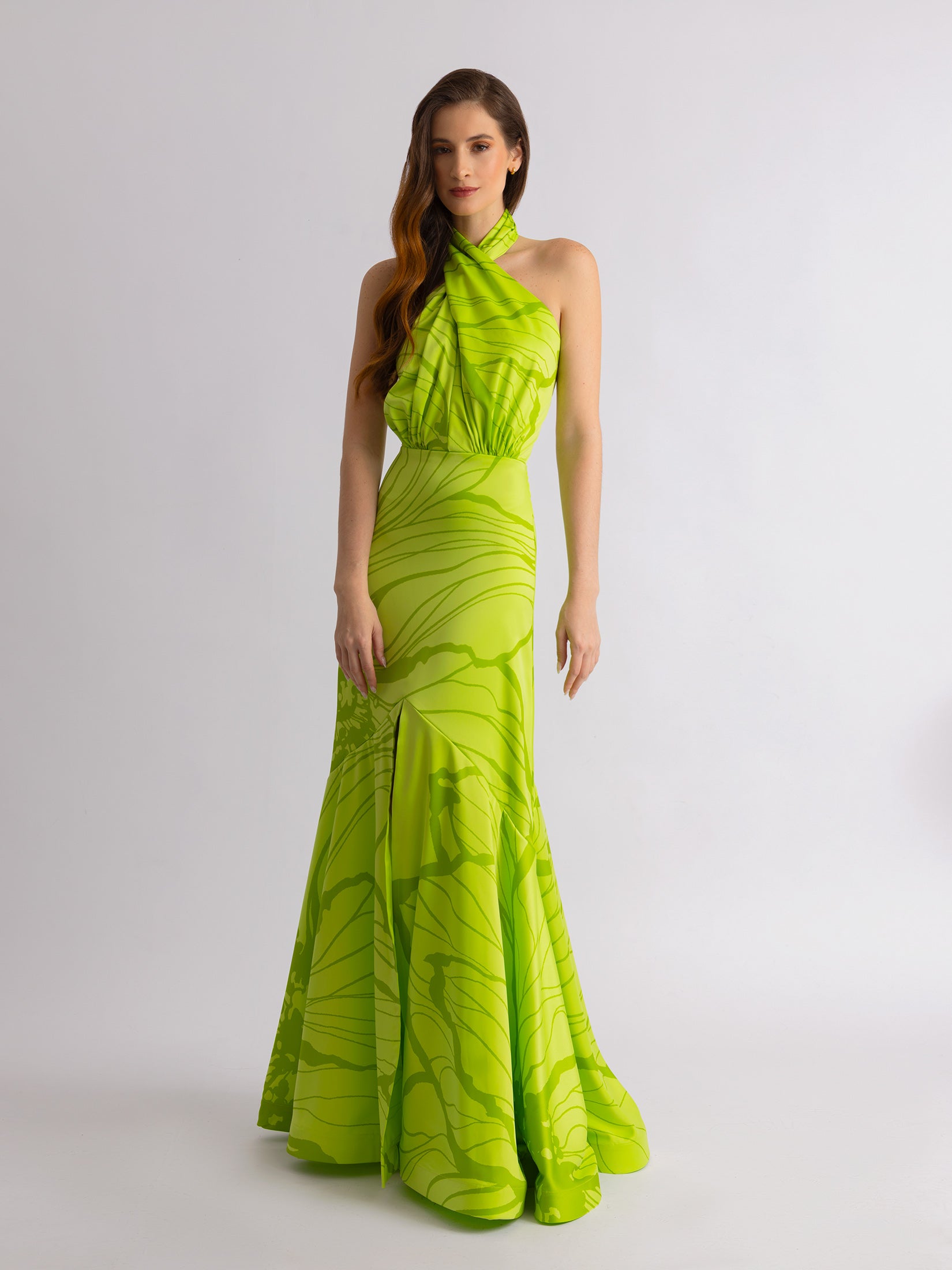 Su silueta sirena, suave y envolvente, esculpe el cuerpo con delicadeza mientras que el escote halter drapeado al cuello realza el rostro y estiliza los hombros, logrando un efecto alargador y sofisticado. El estampado orgánico, una firma de la marca, evoca el movimiento de la naturaleza sobre la seda, generando un brillo sutil y un juego de luces que transforma cada paso en una danza. Diseñado para mujeres que prefieren impactar desde la calma, este vestido es equilibrio puro entre fuerza y gracia.