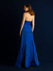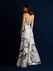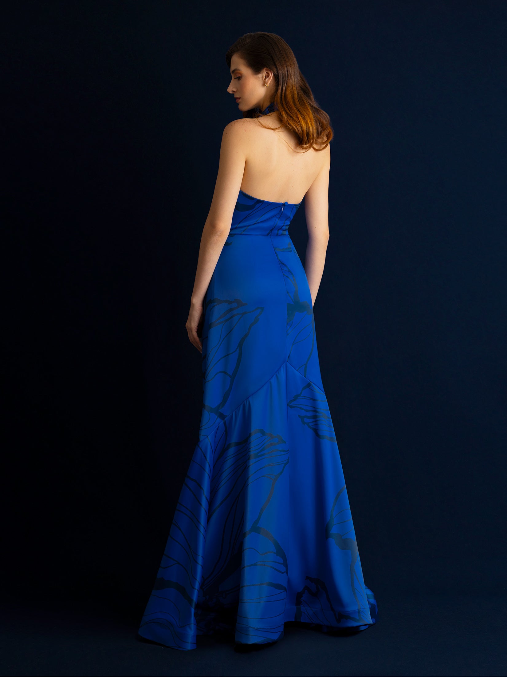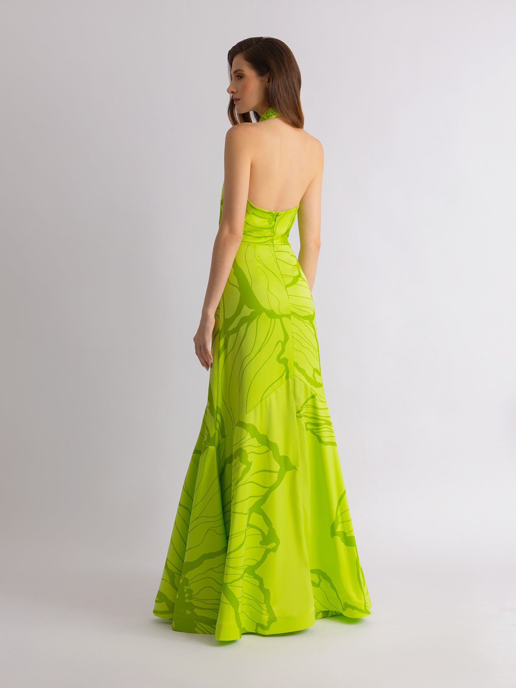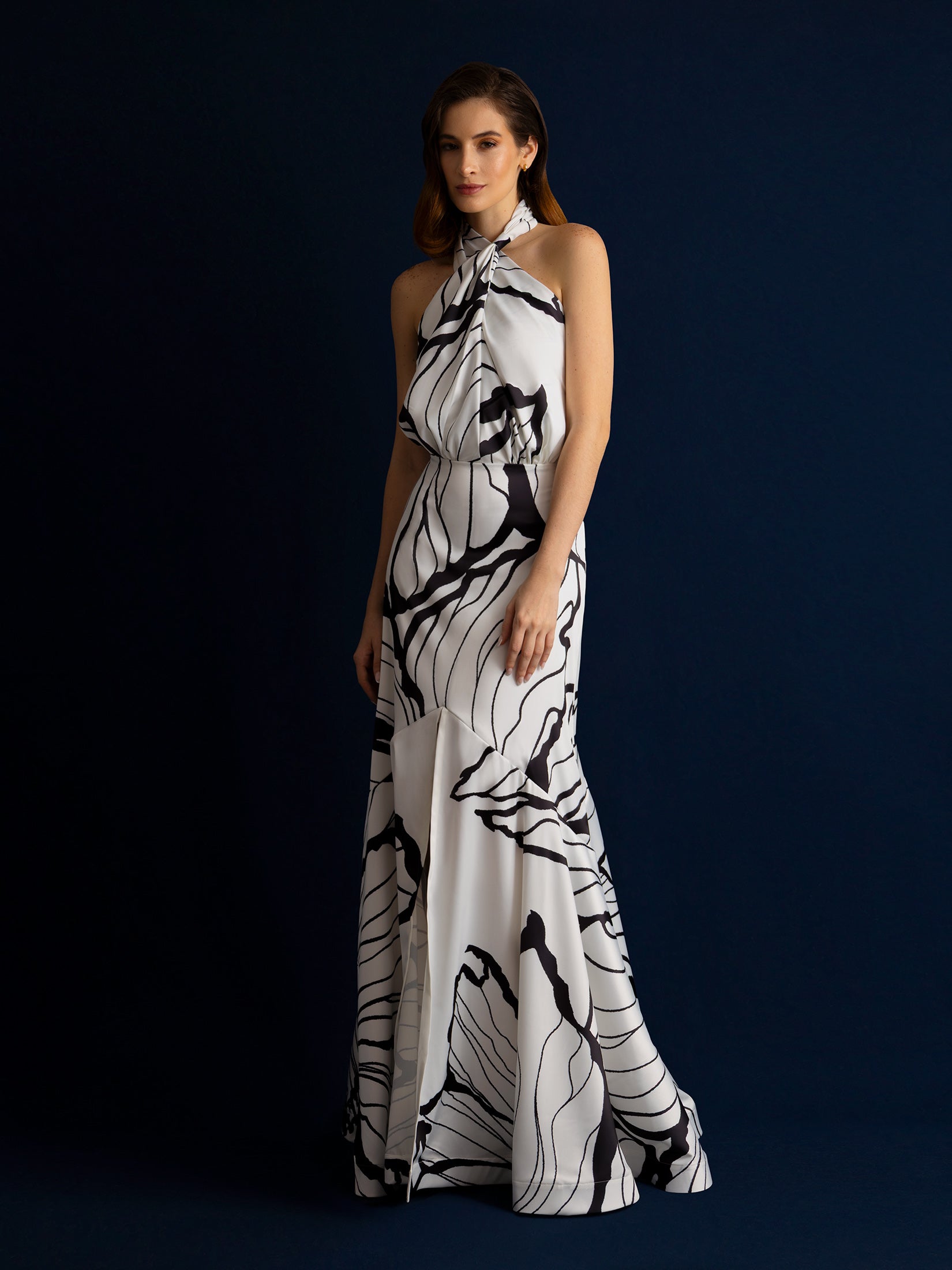 Su silueta sirena, suave y envolvente, esculpe el cuerpo con delicadeza mientras que el escote halter drapeado al cuello realza el rostro y estiliza los hombros, logrando un efecto alargador y sofisticado. El estampado orgánico, una firma de la marca, evoca el movimiento de la naturaleza sobre la seda, generando un brillo sutil y un juego de luces que transforma cada paso en una danza. Diseñado para mujeres que prefieren impactar desde la calma, este vestido es equilibrio puro entre fuerza y gracia.
