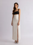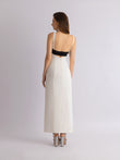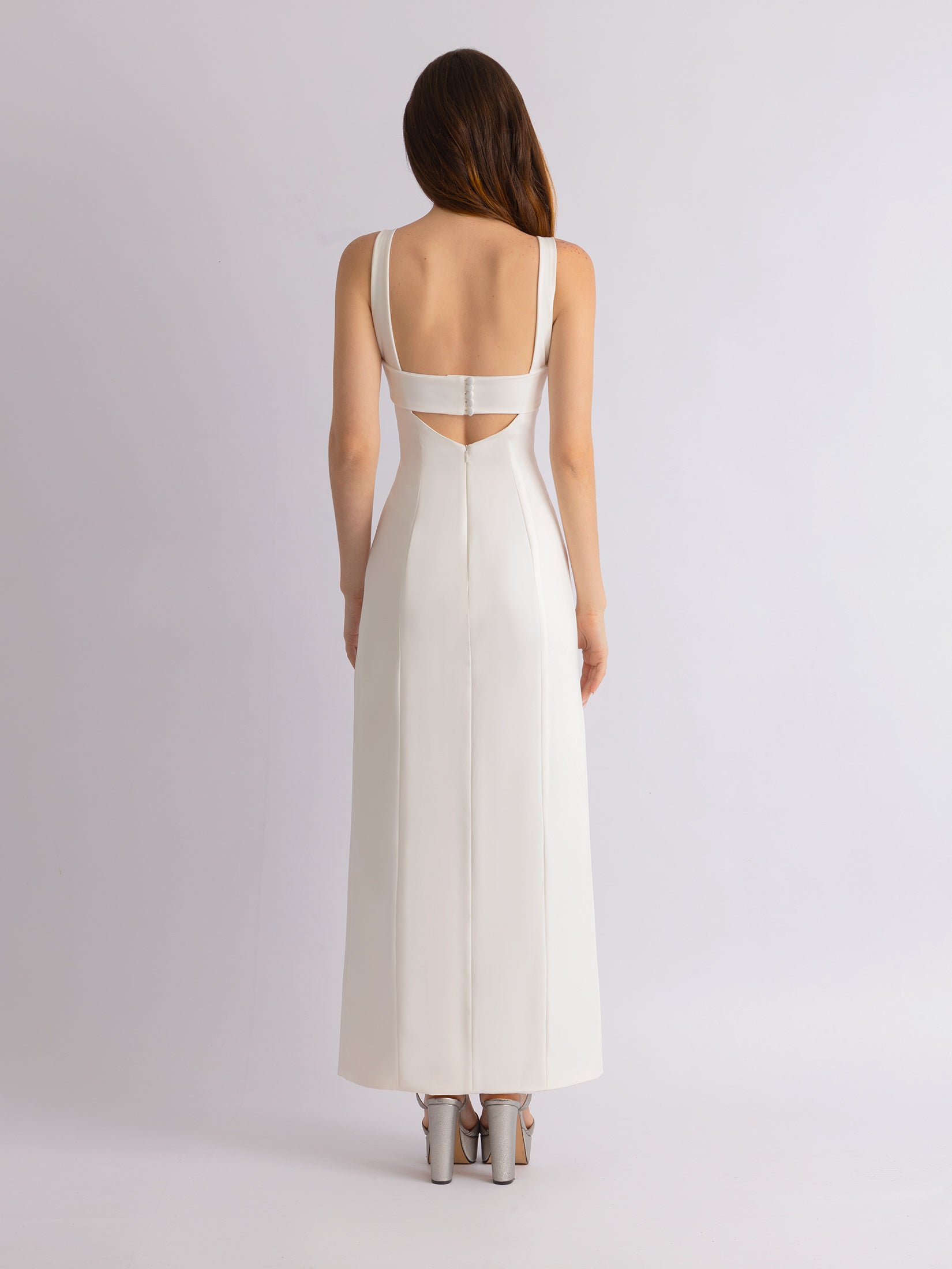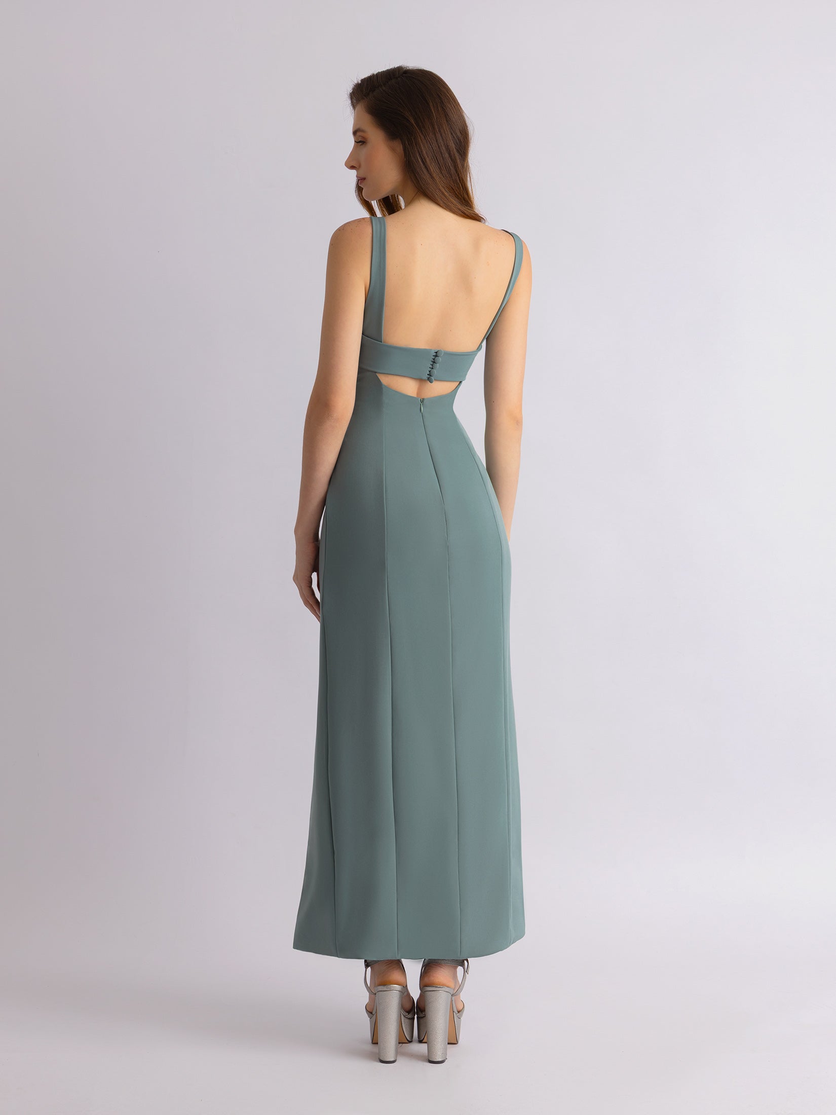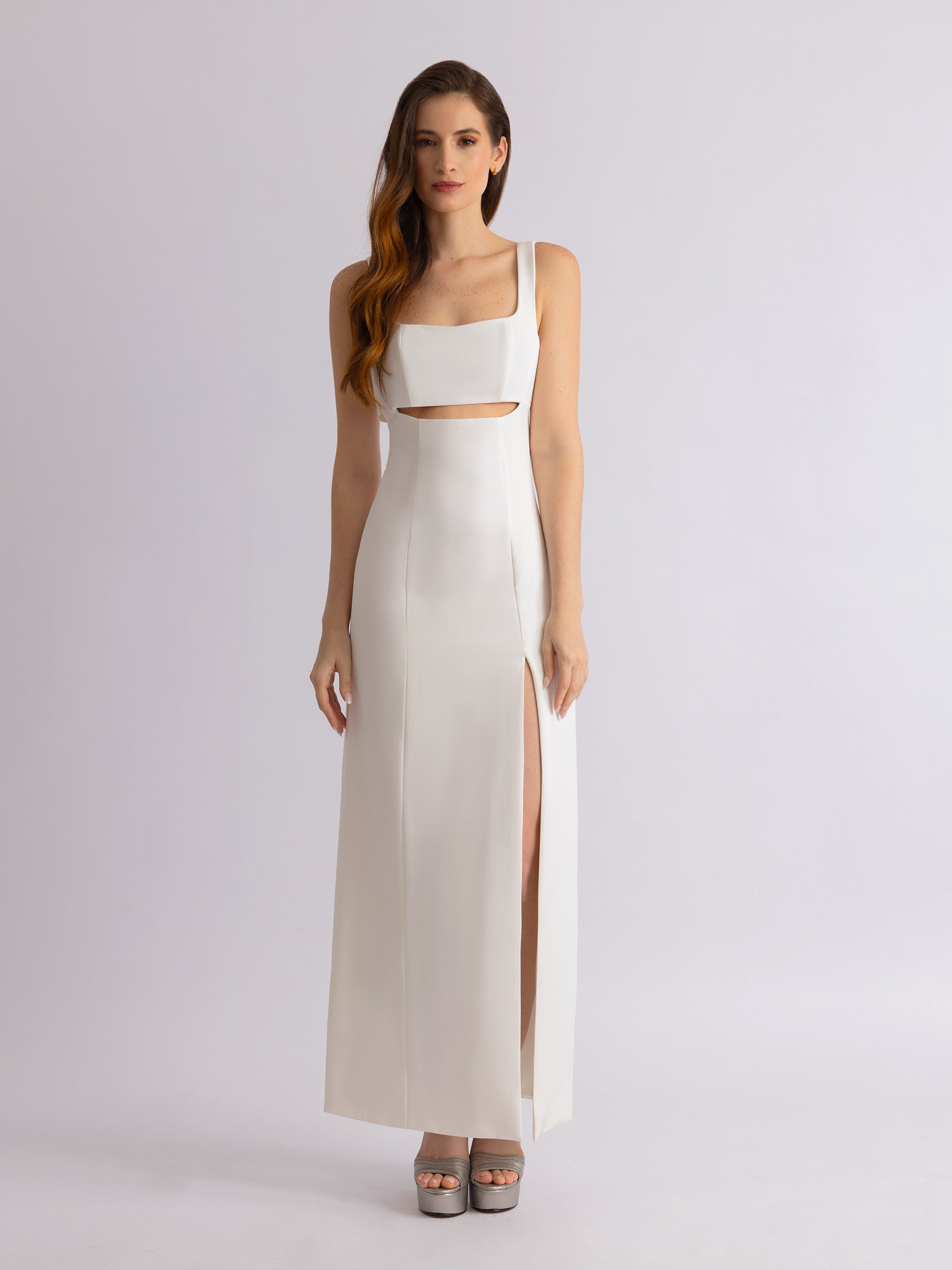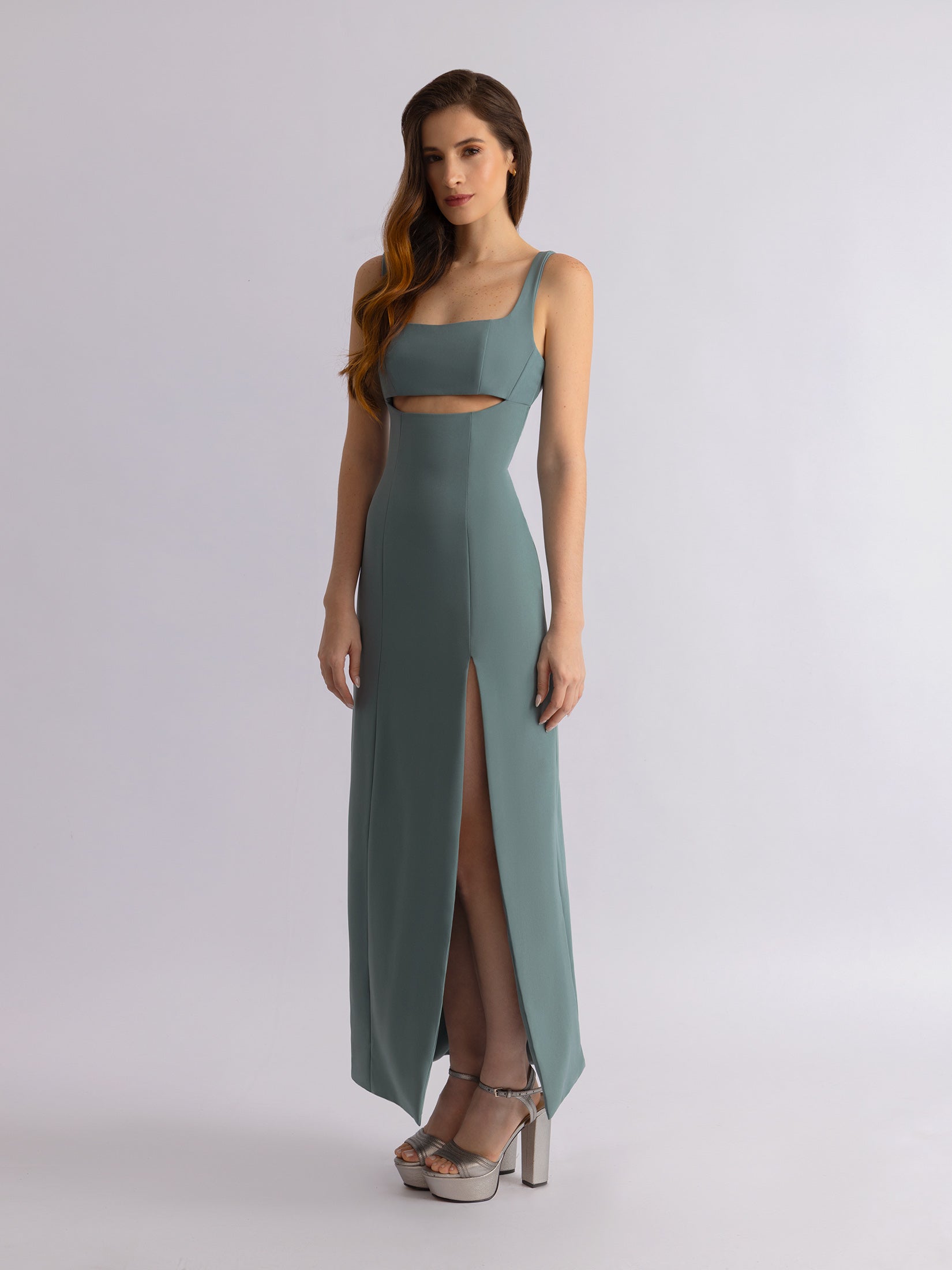 Vestido largo en crepé italiano de alta calidad, con diseño minimalista y silueta ajustada que estiliza la figura. Su escote cuadrado con tirantes anchos aporta estructura, mientras el cut-out frontal bajo el busto revela sutilmente la piel con elegancia. La falda recta con abertura lateral alta alarga visualmente las piernas y añade un toque de sensualidad moderna.