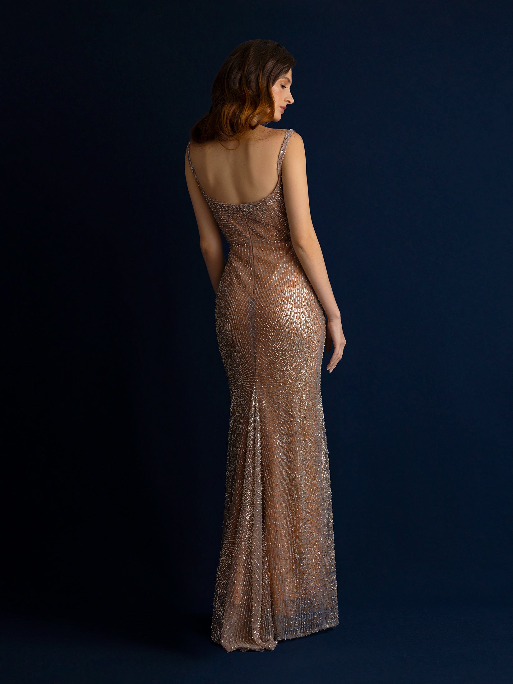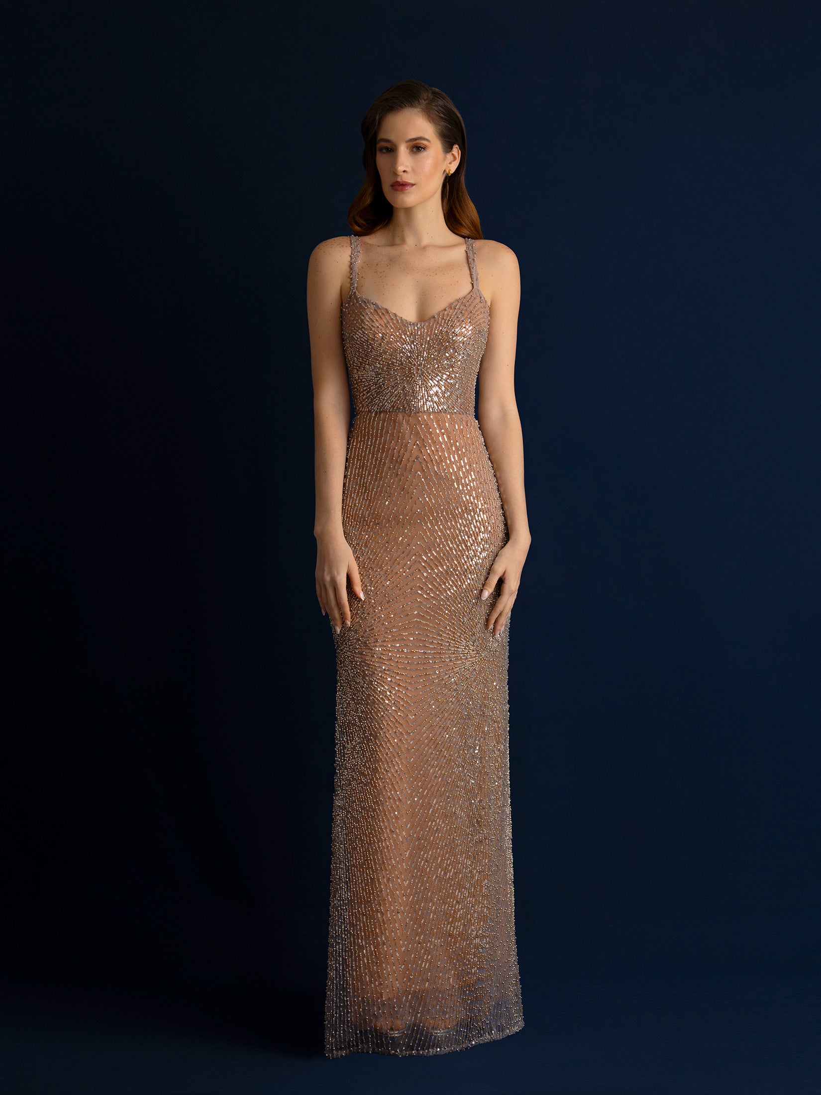 Un vestido que captura la luz como una constelación sobre la piel. “Celeste Doré” es una segunda piel de tul nude bordado con cristales en degradé dorado-rosé, diseñado para realzar la silueta femenina con un brillo elegante y envolvente.