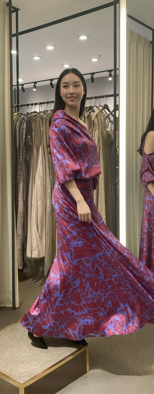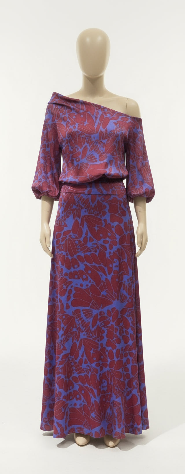 Ese vestido tiene una fuerza elegante y serena, el hombro descubierto le da sensualidad y el estampado violeta profundo transmite arte y confianza.
