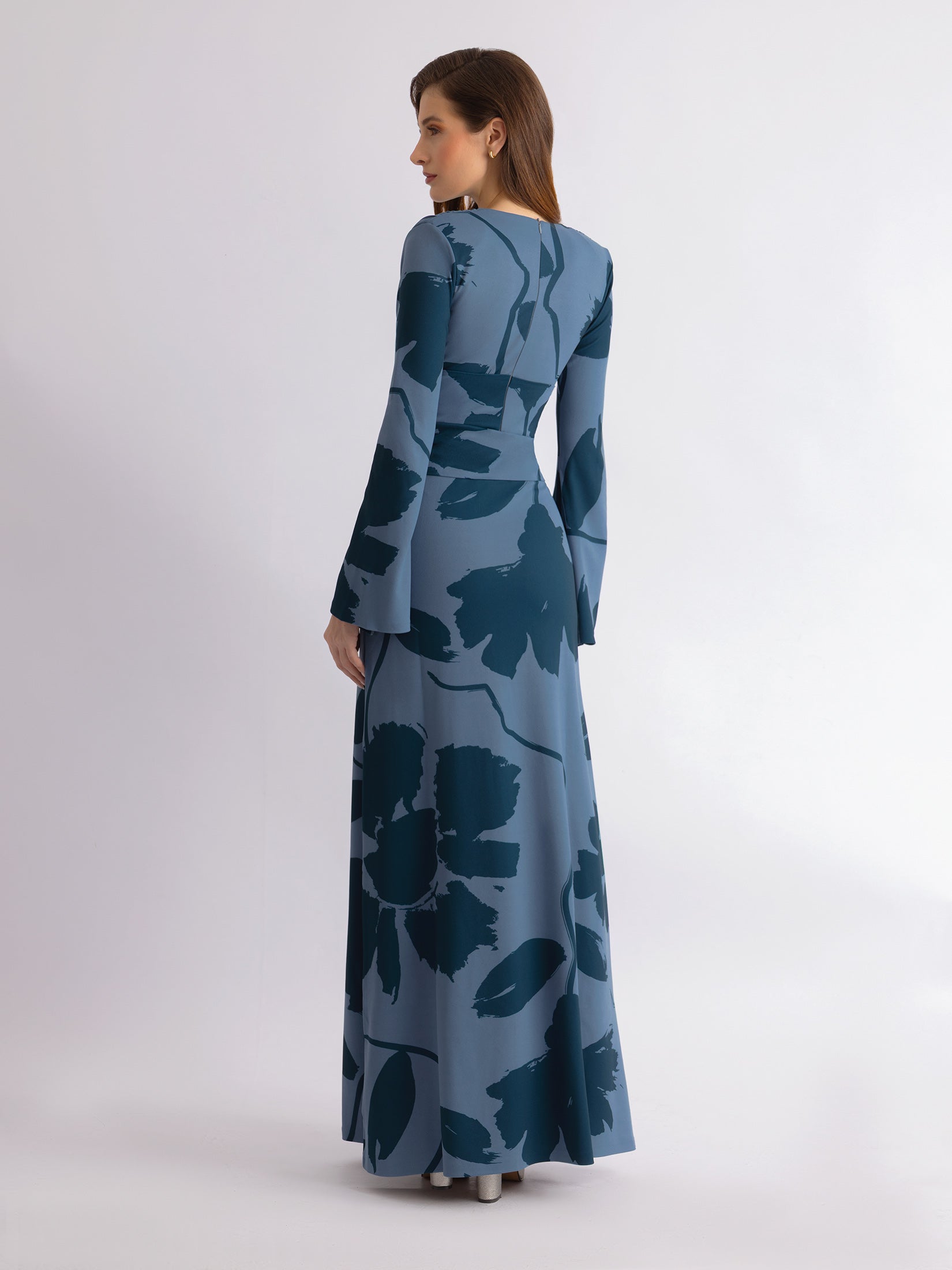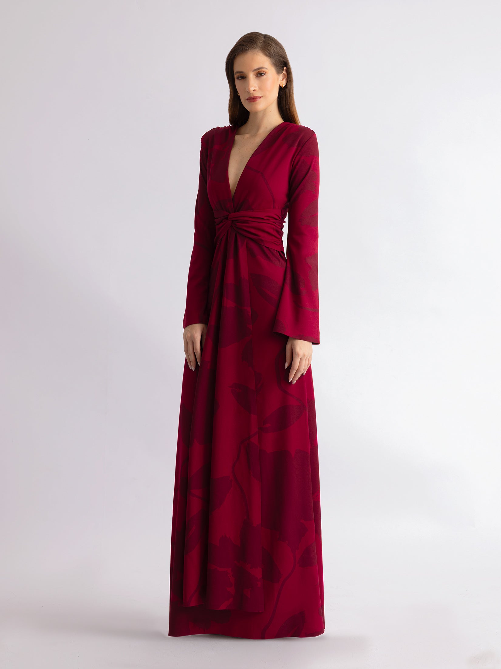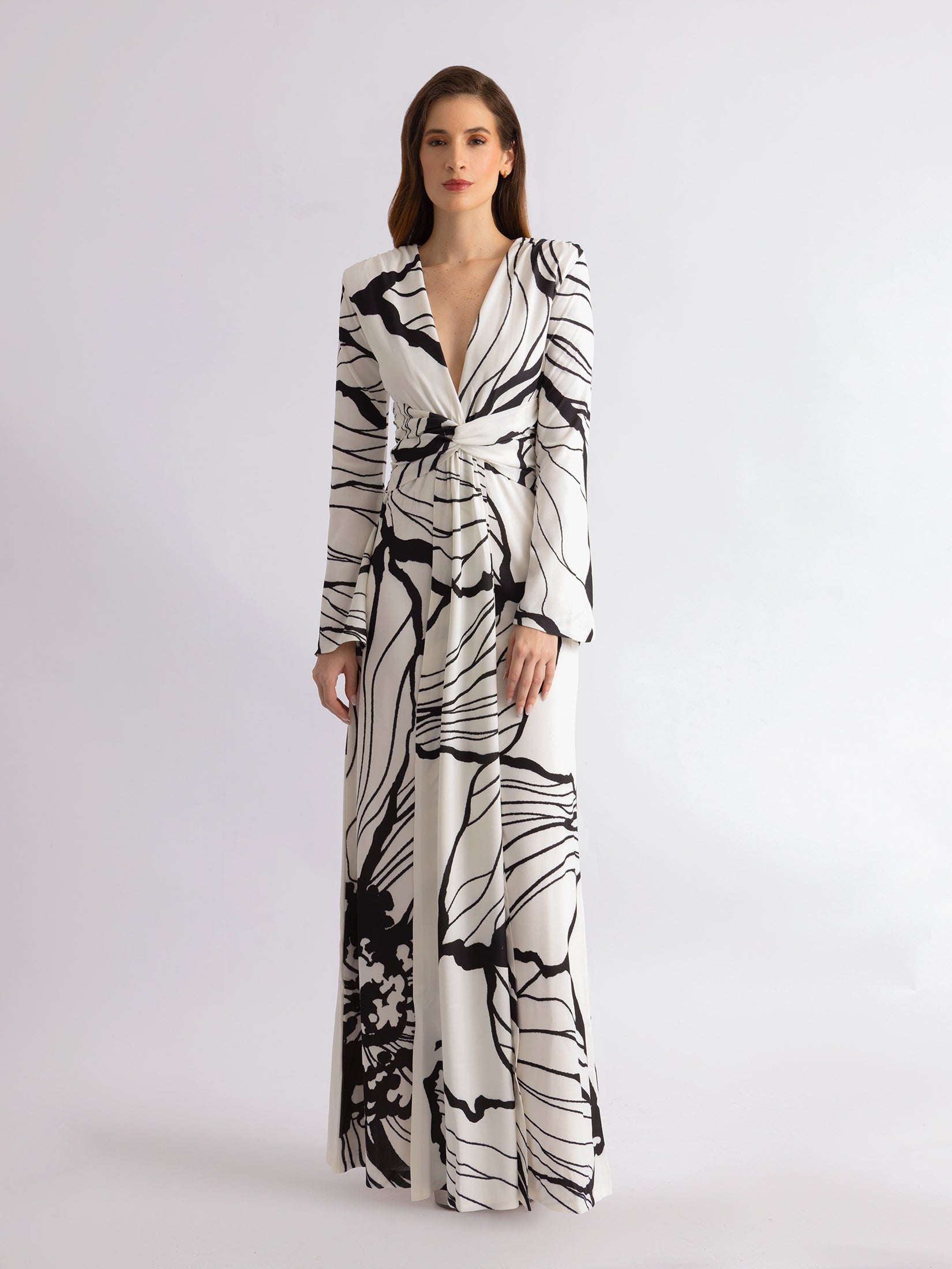 Eset vestido tiene silueta larga y fluida, elaborada en crepé stretch, abraza el cuerpo con una horma impecable que realza las curvas de forma natural —recoge suavemente la cadera y define la cintura con un nudo central que estiliza la figura. El escote profundo en V añade un toque de sensualidad sofisticada, mientras las mangas largas estructuradas equilibran la propuesta con una presencia imponente. El estampado botánico evoca la danza de las sombras sobre pétalos al amanecer: moderno, atemporal y de impacto visual. Un diseño pensado para mujeres que irradian fuerza y sutileza, que prefieren conquistar con elegancia.
