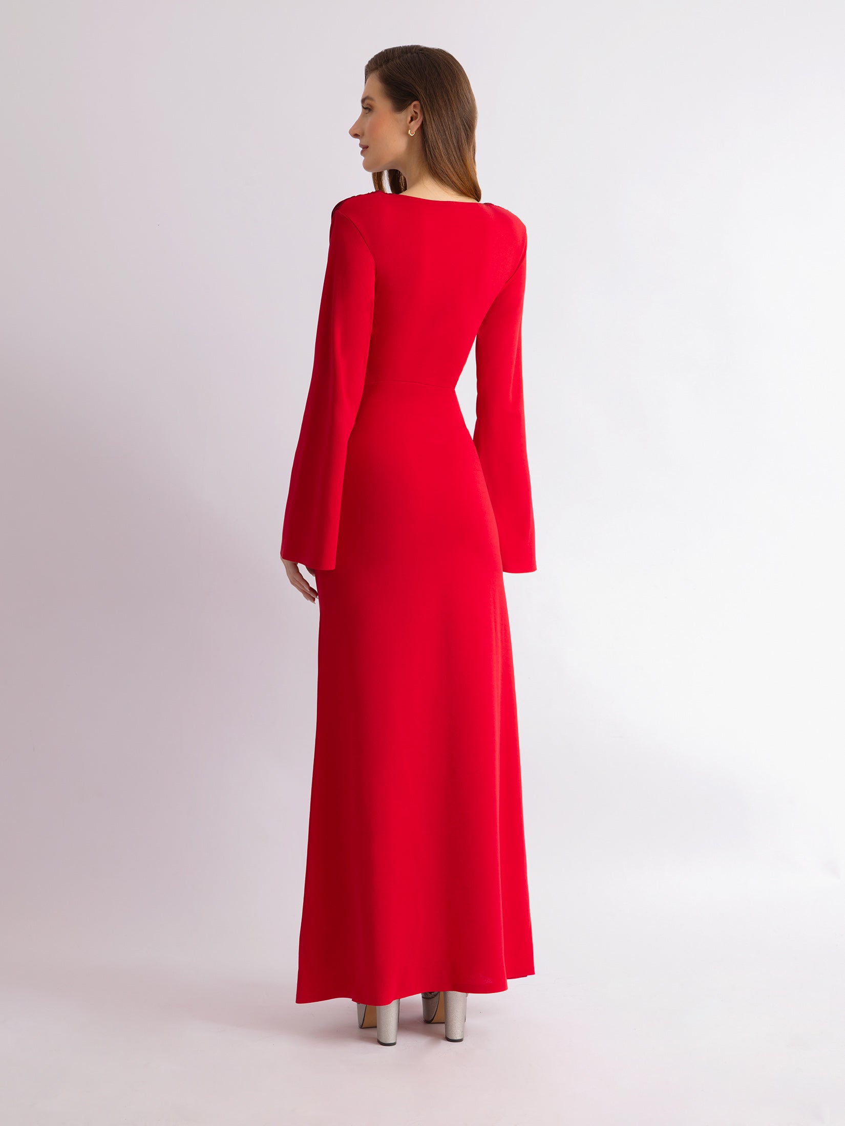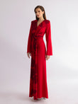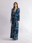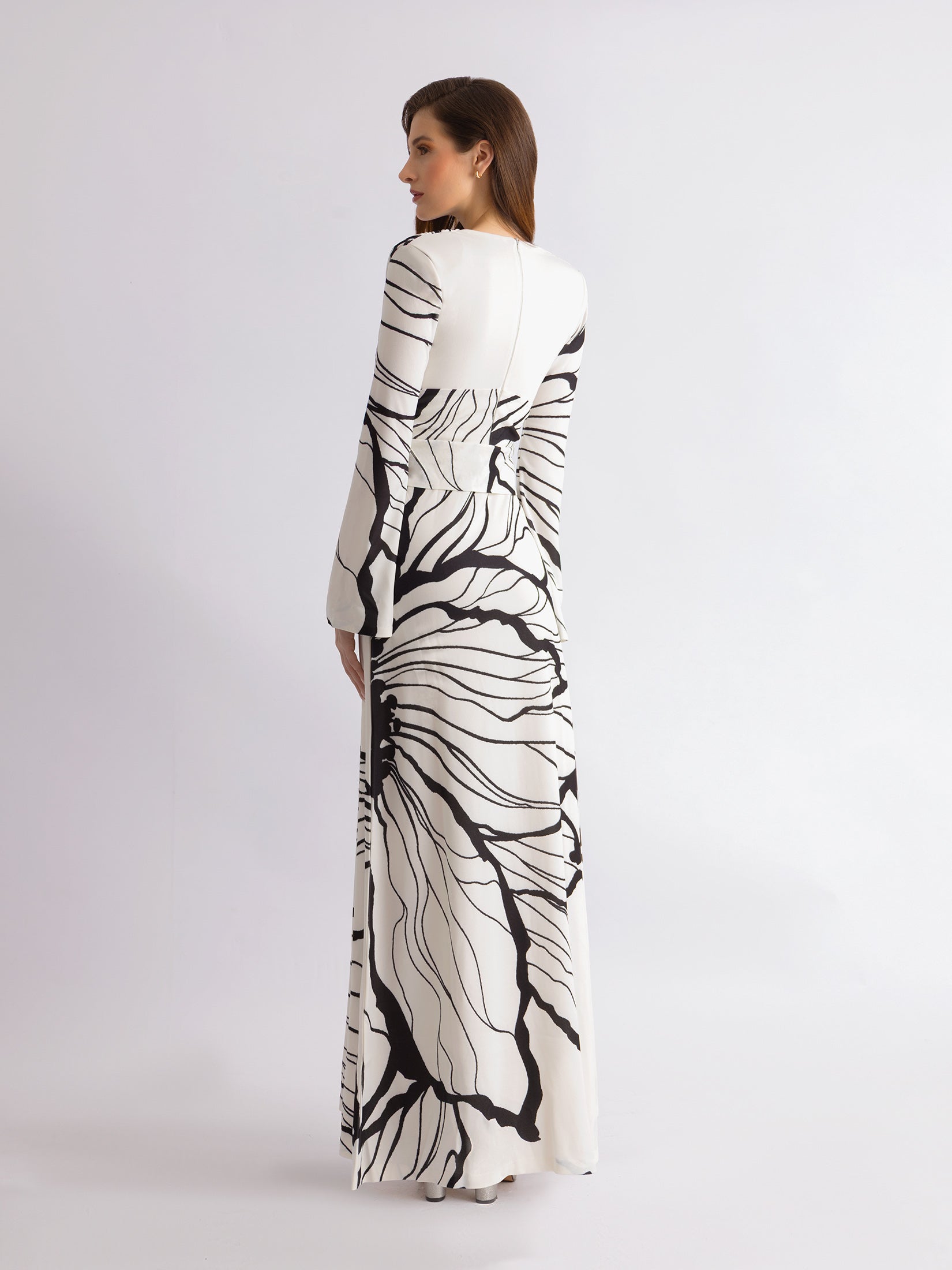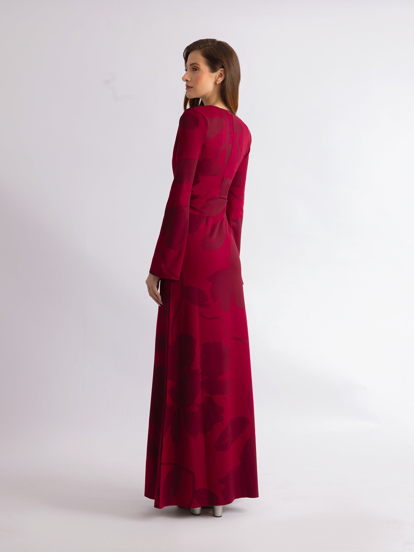 Eset vestido tiene silueta larga y fluida, elaborada en crepé stretch, abraza el cuerpo con una horma impecable que realza las curvas de forma natural —recoge suavemente la cadera y define la cintura con un nudo central que estiliza la figura. El escote profundo en V añade un toque de sensualidad sofisticada, mientras las mangas largas estructuradas equilibran la propuesta con una presencia imponente. El estampado botánico evoca la danza de las sombras sobre pétalos al amanecer: moderno, atemporal y de impacto visual. Un diseño pensado para mujeres que irradian fuerza y sutileza, que prefieren conquistar con elegancia.
