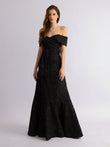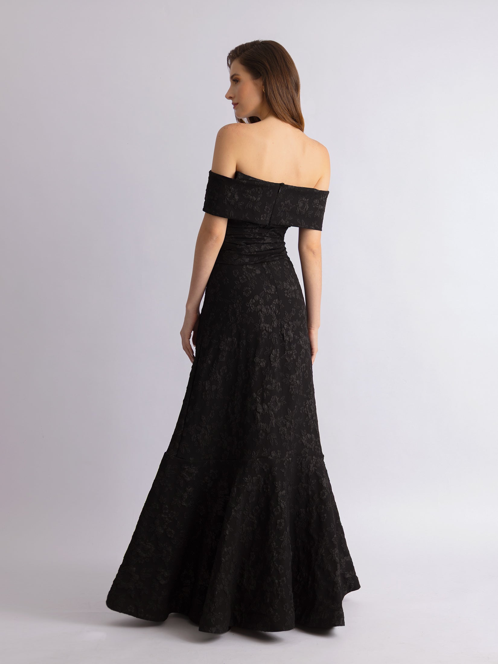 En su quietud, la noche se viste de textura y misterio. Gaby Notturna, abraza los hombros con una elegancia que no necesita adornos, el poder está en la estructura, en la sombra que insinúa y no revela. Su jacquard floral respira bajo la luz, dibujando relieves como pensamientos ocultos.