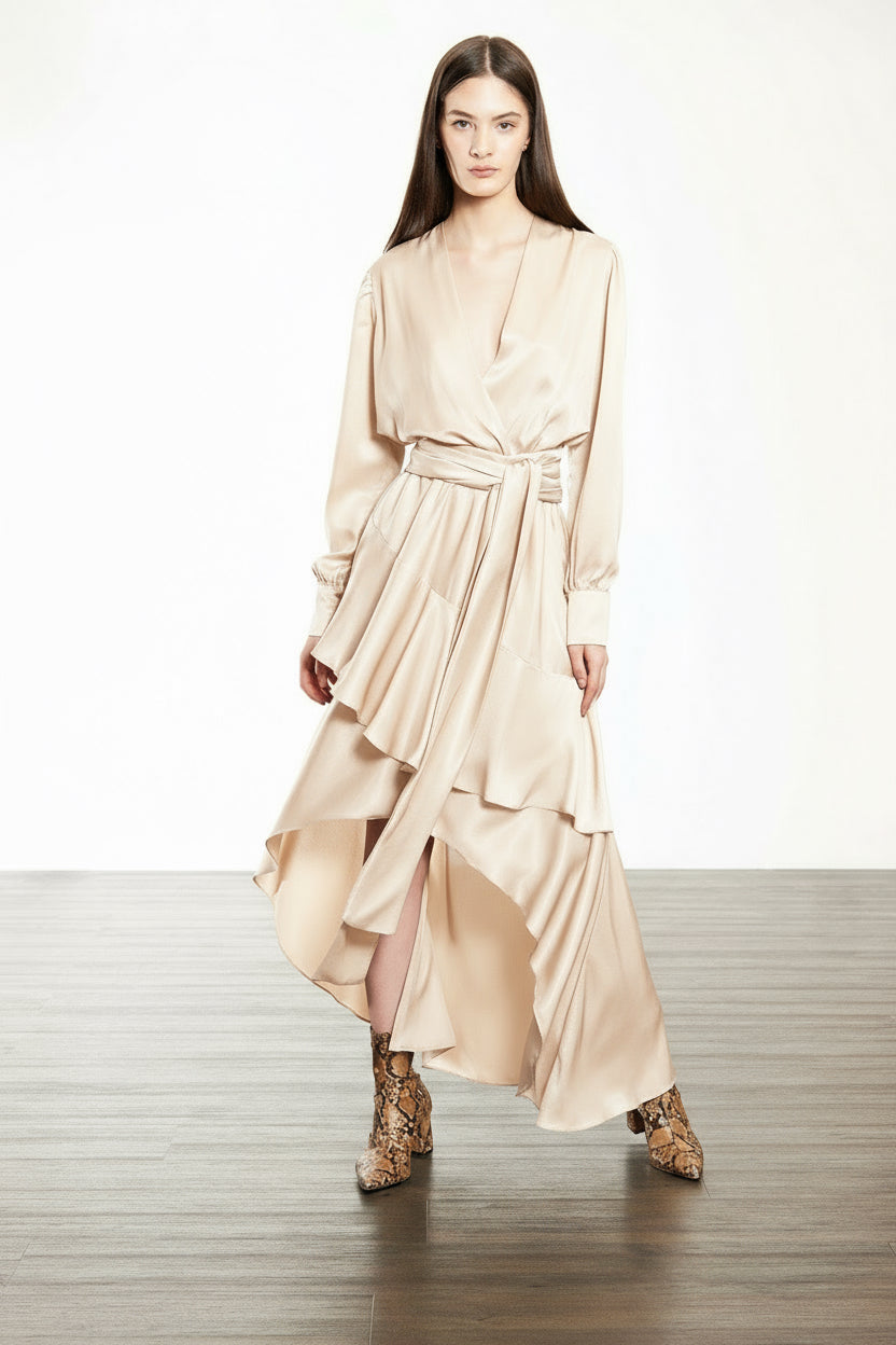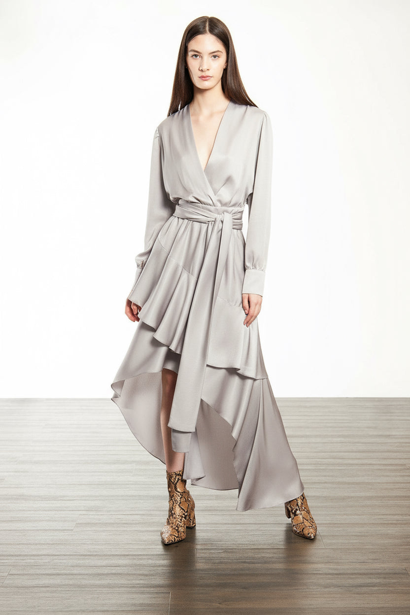 Vestido de manga larga. Tiene un escote en “V” y mangas largas con puños. Un cinturón resalta la cintura. Esta prenda combina sensualidad y estructura. La falda asimétrica en capas fluidas aporta movimiento y una caída natural que realza la silueta al caminar. Ideal para eventos de día o de noche, es un vestido versátil que refleja carácter, feminidad y distinción con sello contemporáneo.